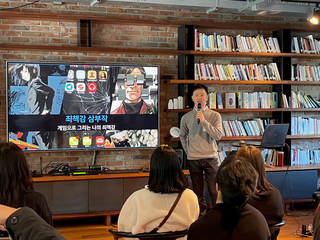 ‘죄책감 삼부작: 게임으로 그리는 나의 죄책감’이라는 주제로, 레플리카, 리갈던전, 그리고 더웨이크를 만들게 된 계기와 출시 이후의 소회를 발표했고, 이어서 이 행사에 초대해 주신 오영진 교수님과 함께 대담을 나누는 자리를 가졌다.