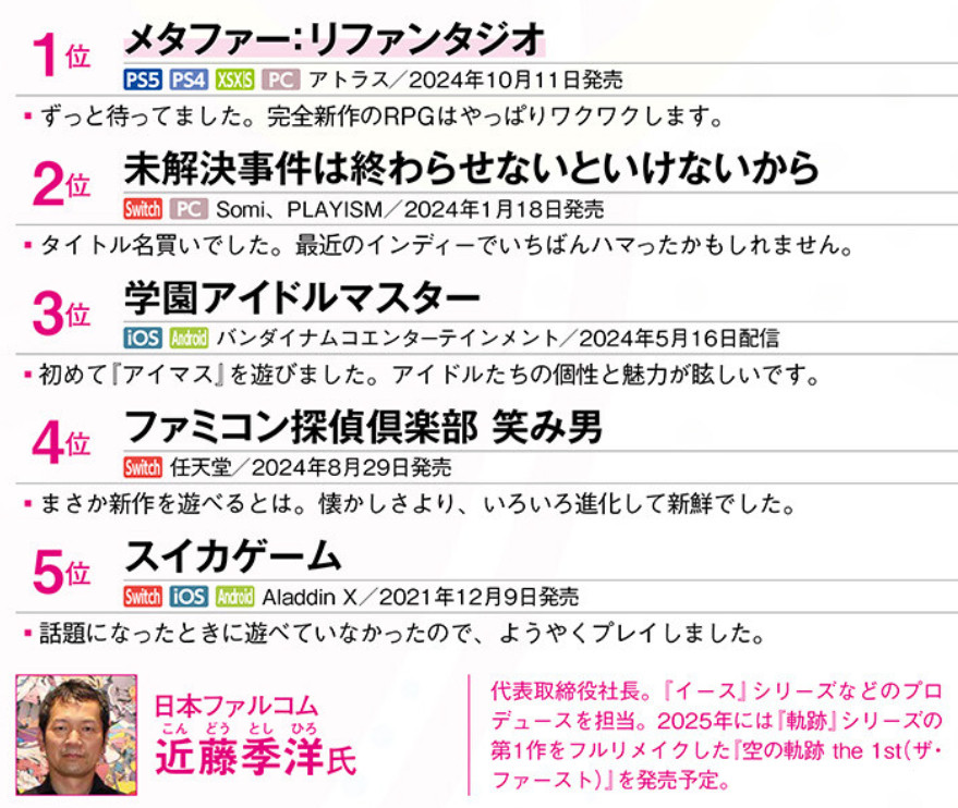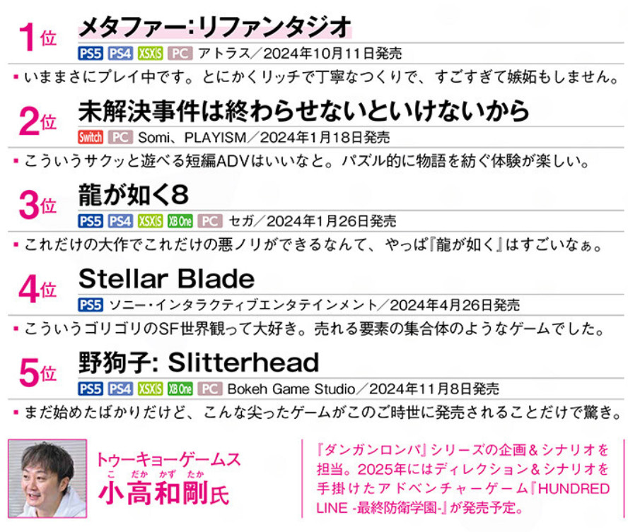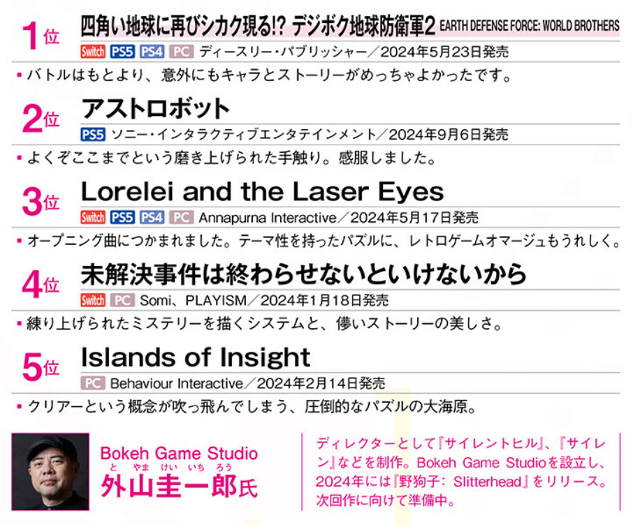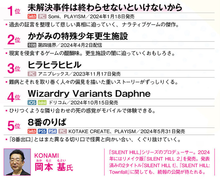 12월 26일 일본 게임 매거진 패미통(ファミ通)에는 일본의 게임업계 주요 인사들이 선정한 2024년도 ‘개인적’ GOTY가 발표되었다. Silent Hill 시리즈의 프로듀서인 Motoi Okamoto님께서 ‘미제사건’을 1위로 선정해 준 것을 비롯하여 많은 분들께서 내 게임을 순위에 올려 소개해 주었다.