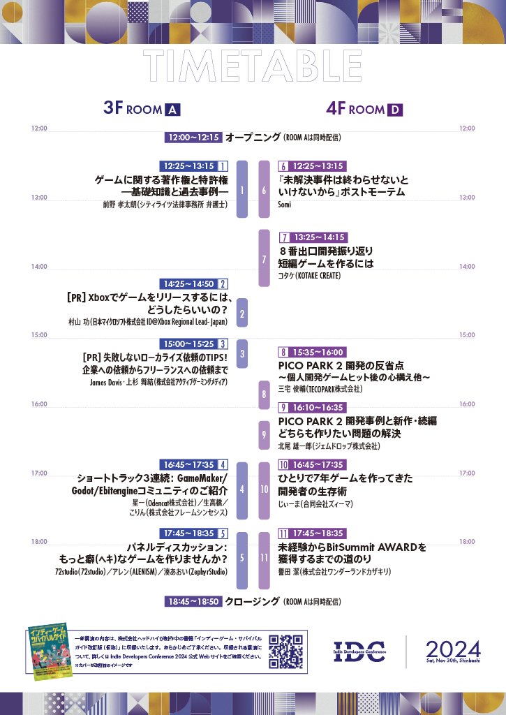 11월 30일 일본 도쿄에서 개최된 Indie Developers Conference 2024(IDC 2024)에 초청되어 ‘미제사건은 끝내야 하니까 – 포스트모템’을 발표했다. ‘미제사건’의 플레이어 중 과반수가 일본분들이기 때문에 포스트모템을 처음 발표하는 곳이 일본이라는 것은 나름의 의미가 있었다.