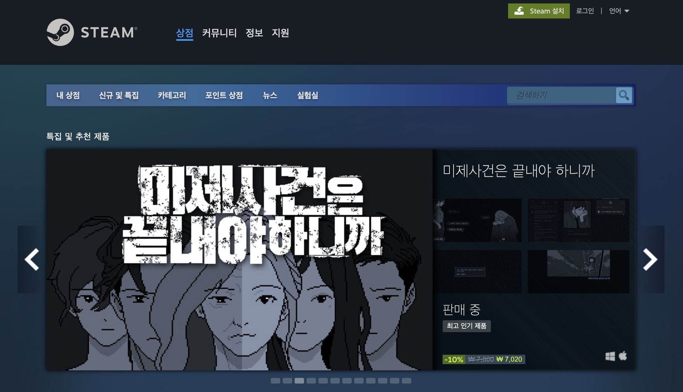 출시 직후인 1월 19일, Steam ‘특집 및 추천 제품’ 배너에 ‘미제사건’이 ‘최고 인기 제품’이라는 태그를 달고 게시되었다. 2016년도에 ‘레플리카'(Replica)를 출시했을 때도 스팀 초기화면의 상단 배너에 소개된 경험이 있었지만, 인디게임이 스팀이라는 플랫폼에서 주목받는다는 것이 훨씬 어려워진 구조적, 환경적 변화를 감안하면 이전과는 전혀 달리 봐야할 업적이라 여겼다.