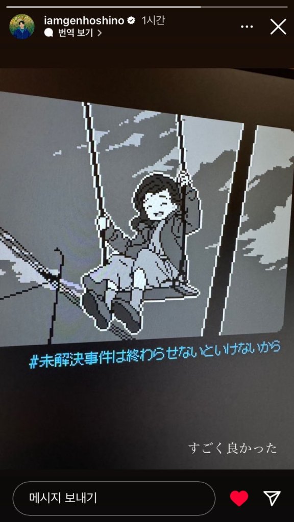 2월 10일 일본의 유명 배우이자 싱어송라이터인 호시노 겐(Gen Hoshino)님께서 ‘미제사건’을 플레이하고 Instagram 스토리에 “すごく良かった”라는 평과 함께 게임 화면을 게시해 주셨다.
