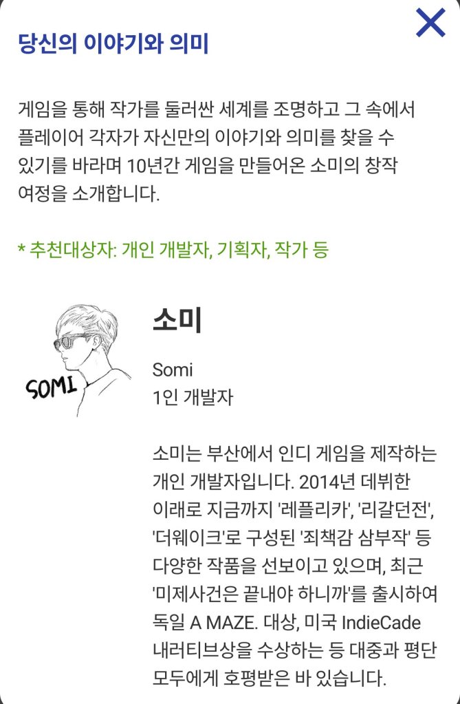 처음에는 지난 마지막 블로그 글 이후에 참석했던 몇 개의 게임 축제 참가 경험을 뒤늦게라도 정리해서 게시하려고 했는데 적다 보니 ‘미제사건’의 여정 전체에 대한 기록이 되었다. 아마도 다음 블로그 글은 올해 A MAZE./Berlin에 심사위원으로 참석했던 이야기 정도일텐데, 그 이후에는 한동안 개발자 ‘소미’로서 전할만한 이야기가 없을 듯하다.