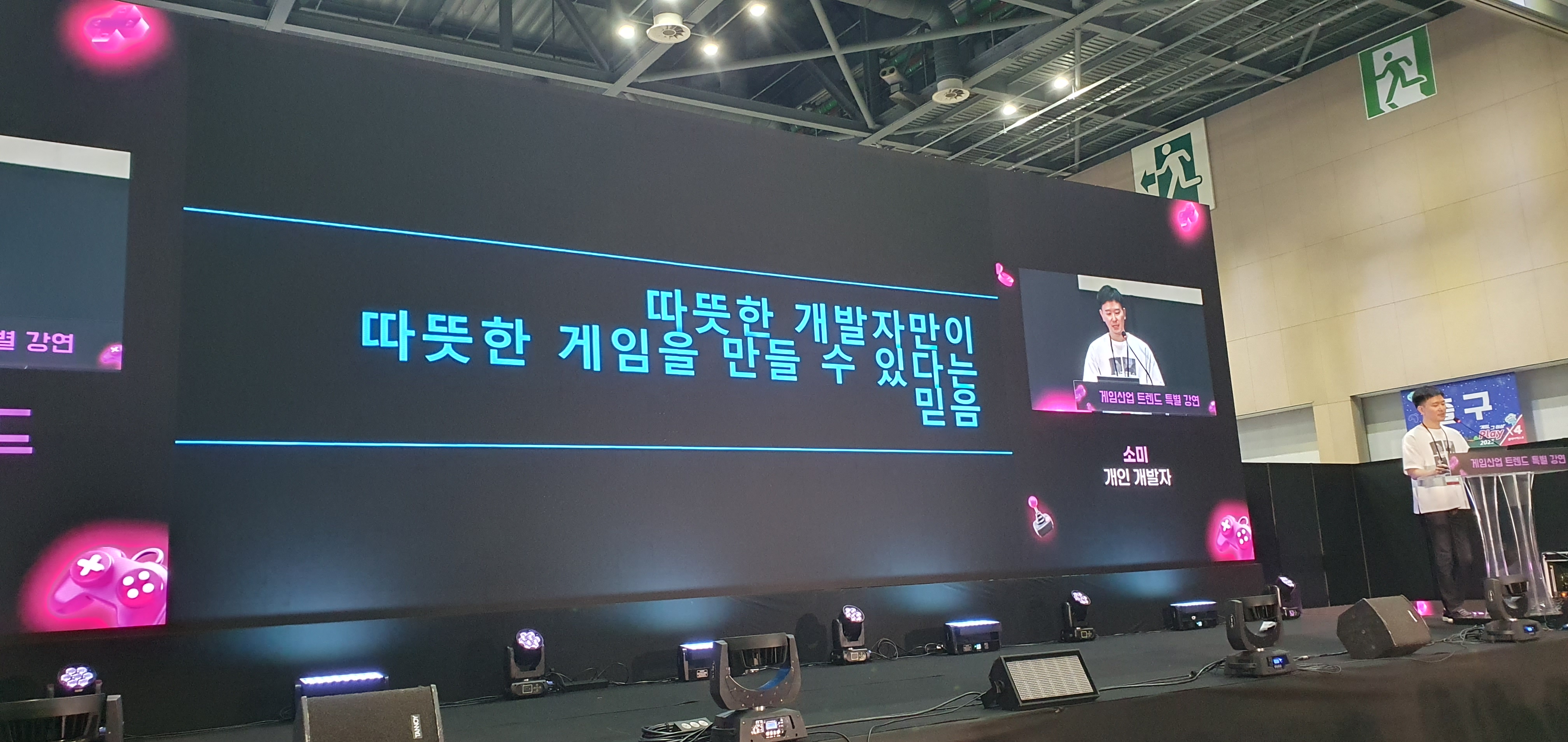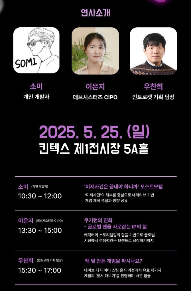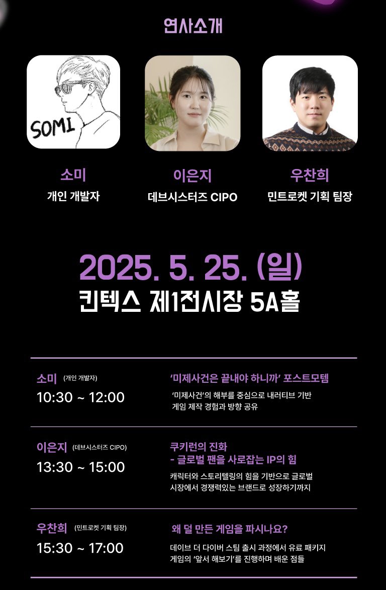 시간대를 달리하여 같은 날 초청된 다른 연사로는 ‘민트로켓’과 ‘데브시스터즈’ 소속 직원분들이 있었다. 강연 전체의 테마도 ‘게임산업 트렌드 특별 강연’이었던 터라 내 존재와 강연 주제에 대해 다소 위화감이 들었지만, 강연을 마친 후 인사하러 와준 팬분들의 응원 덕분에, 멀리서 내 강연때문에 새벽부터 출발했다는 이야기 덕분에, 그래도 이런 시간을 가지길 잘 했다는 안도감이 들었다.