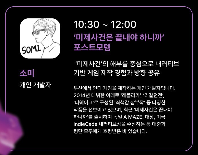 IGF를 끝으로 ‘미제사건’의 전시 일정은 모두 마쳤다. 이후 ‘미제사건’을 포함하여 지난 10년간 게임을 만들어온 창작여정과 개발 철학을 소개하는 자리를 몇 차례 가졌는데, 평범한 부산 아저씨의 지껄임에 생각보다 많은 분들이 관심가져 줘서 의외였다.