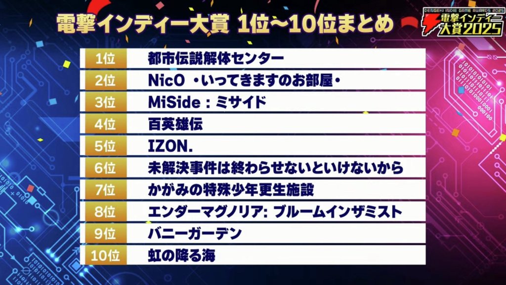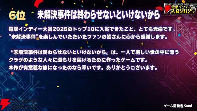 5월 23일 일본 비디오게임 미디어인 ‘전격 온라인'(電撃オンライン)에서 주최하는 ‘전격 인디대상 2025′(電撃インディー大賞 2025)에서 ‘미제사건‘이 어드벤쳐 부문 4위, 종합 순위 6위를 달성했다.