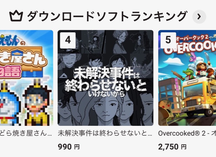 출시 직후 ‘미제사건’은 일본 다운로드 랭킹에서 4위에 오르는 기염을 보였다. 컴퓨터 마우스 조작을 기반으로 제작된 게임이고 내가 직접 이식을 위한 UI개선 등의 작업에 참여하지 않았기에 조작의 편의성이나 기기와 게임의 플레이 방식간 밀접성과 같은 부분에서 다소 아쉬움이 남기도 했지만, Playism과 닌텐도 Indie World의 구성원들이 보여준 아낌없는 지원, 그리고 작품을 사랑해주는 팬분들의 힘이 얼마나 큰지 다시 한 번 느낄 수 있었던 계기가 되었다.