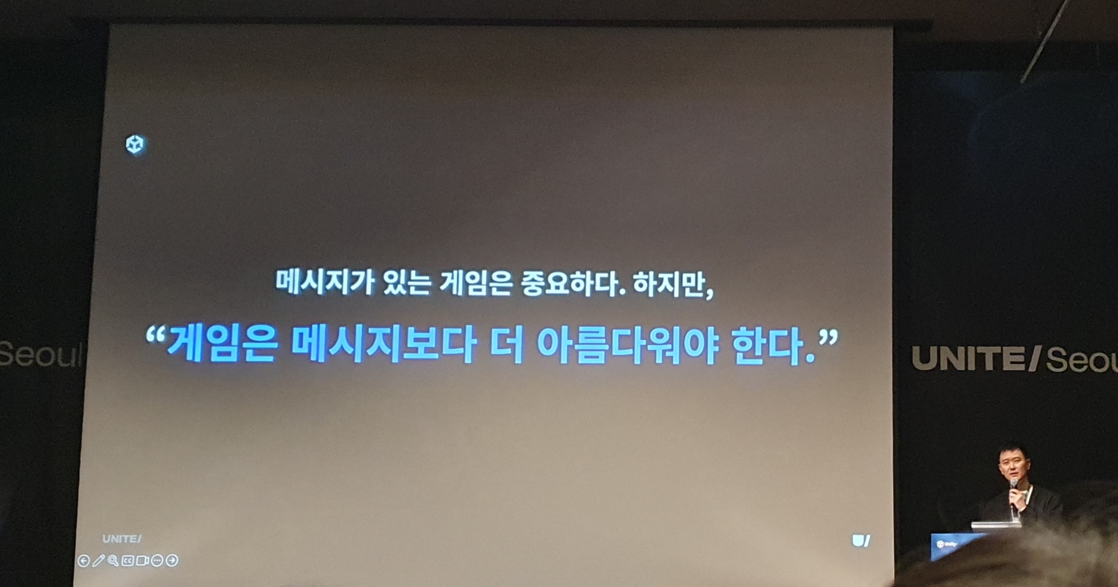 2025년 4월 15일 서울 코엑스에서 개최된 Unite 2025 행사에서 ‘당신의 이야기, 당신의 의미’라는 제목으로 강연했다. ‘메시지보다 더 아름다운 게임’이라는 내 모토가 잘 전달되었기를 뒤늦게나마 바라본다.
