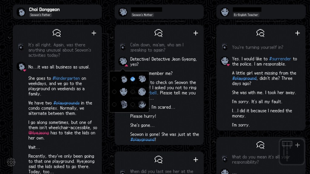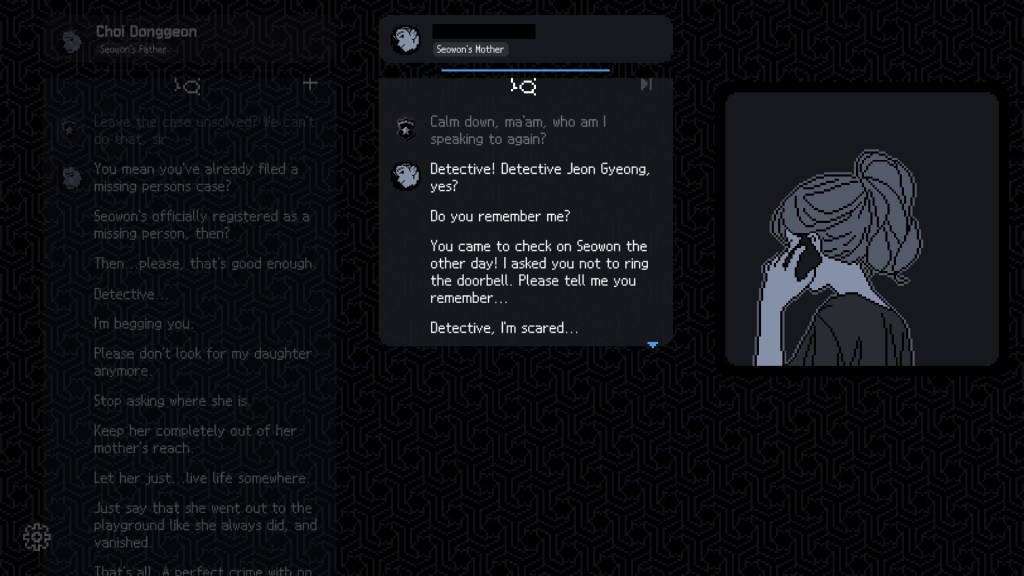 #No_Case_Should_Remain_Unsolved is a detective game where players uncover and piece together memory fragments to solve a long-forgotten case. Follow former police detective Jeon Gyeong as she acquires clues and testimony relating to the case of a missing girl.